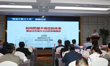 在特邀报告环节,首先由王怀民院士带来题为《如何把握不确定的未来,兼谈泛在操作系统的发展模式》的报告,介绍了构建面向泛在计算环境的新型操作系统基础理论、方法与系统,并从为什么、做什么、谁来做、怎么做四个方面讨论了泛在操作系统的若干问题,最后倡议通过政府、企业、民间合作完成构建泛在操作系统的开源软件生态,用多样性应对不确定性,用行动创造未来。