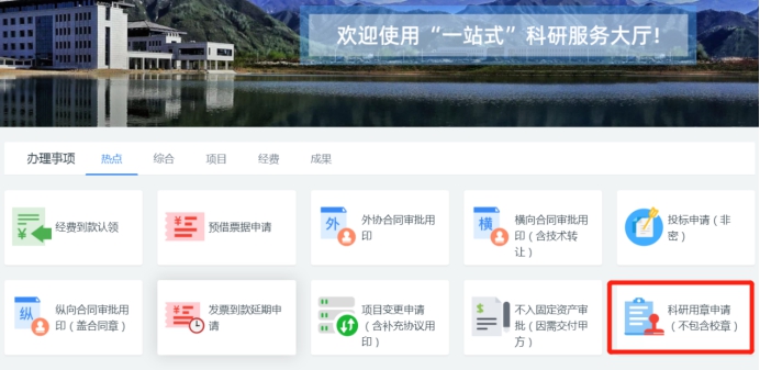2. 办理地址:登录翱翔门户,点击“科研系统”进入系统博彩社区;在博彩社区办理事项栏选择“科研用章申请”。