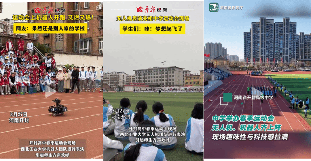 西北工业大学无人机团队和WMJ战队受邀为开封高中春季田径运动会开幕式进行科技展演。由团队自主研发的2台舞蹈机器人以及2架无人机带来表演,将现场气氛推向高潮。表演结束后,西工大科技表演团队还向开封高中领导以及师生展示无人机以及机器人技术细节,并介绍相关专业的课程设置与就业前景。本次西工大科技亮相中学运动会受到社会广泛关注,多家媒体报道。