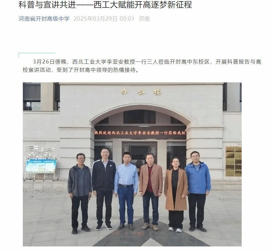 李亚安教授一行以及来自无人机团队和WMJ机器人战队的8名西工大学子于25-28日赴开封市杞县中学、开封高中和河南大学附属中学三所重点高中,开展为期四天的“科技进校园”系列活动。活动涵盖科普讲座、招生政策解读、赠送喜报及科技展演等内容,累计吸引超2500名师生参与,掀起校园科技热潮。
