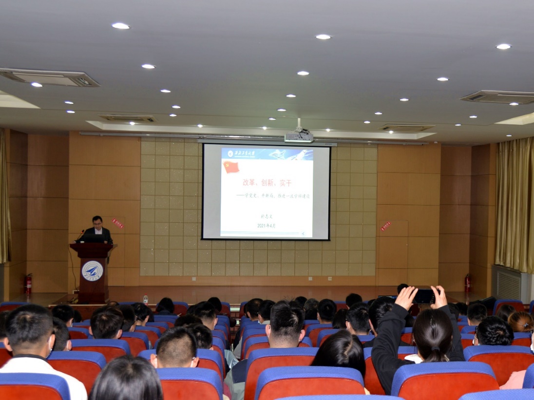 青年教师,讲题为《改革、创新、实干——学党史、开新局,推进一流学科建设》党课。党课由院长助理郭斌主持。