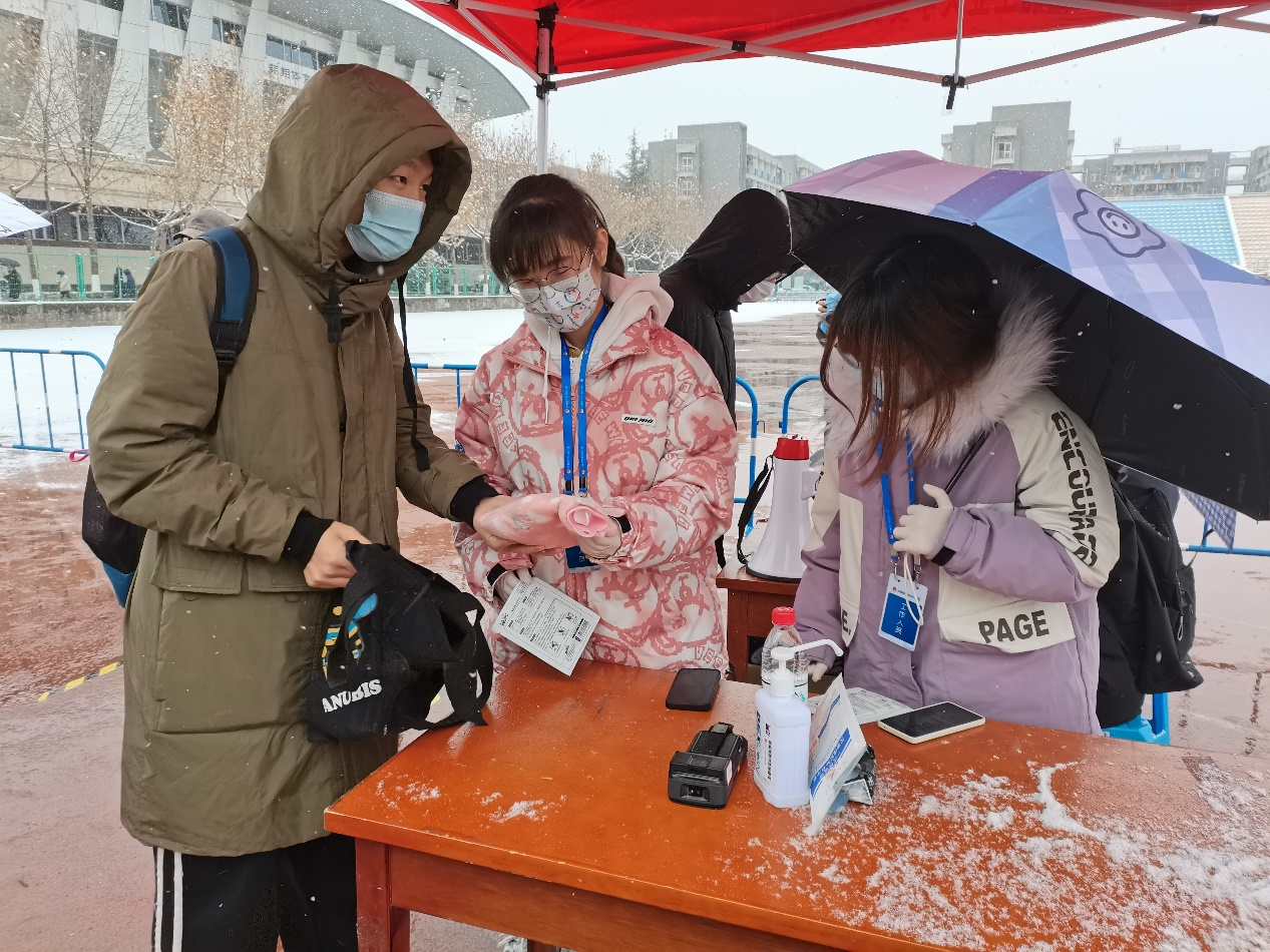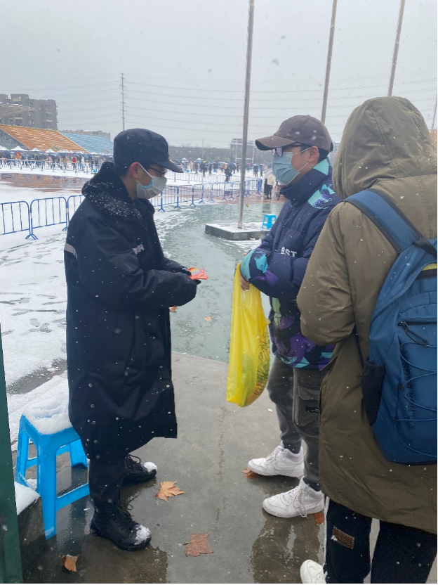 19级学生党支部组成志愿者团队,为在风雪中坚守岗位的志愿者、医护人员以及工作人员送上御寒物资。以一颗颗感恩的心感谢全体捍卫校园安全的医护人员和全体工作人员。在大雪纷飞之中给博彩社区