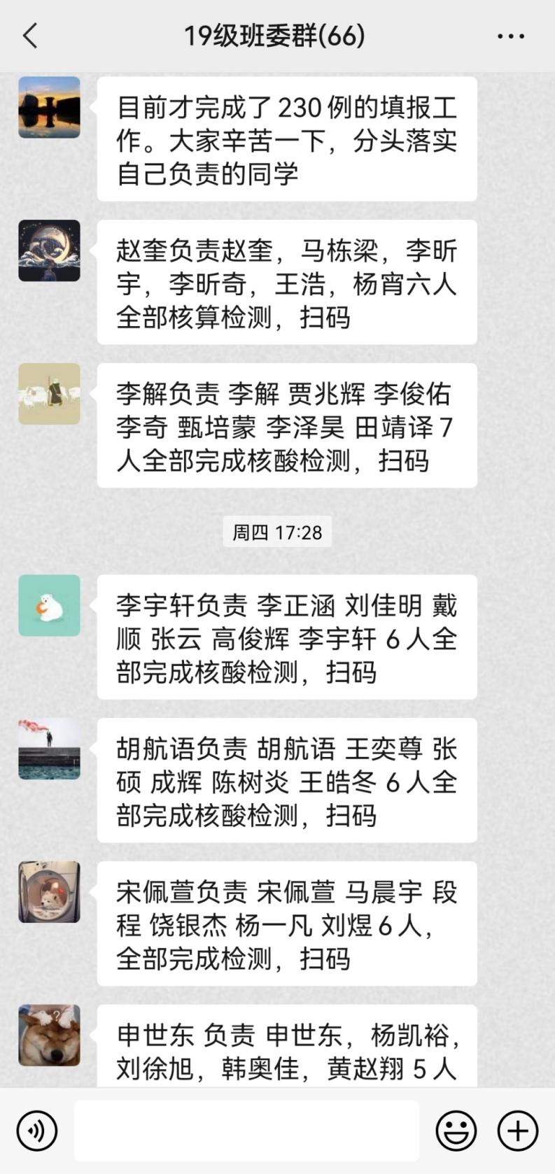 为了高效地开展疫情防控工作,辅导员梁韵基老师组织19级全体班委进行思想动员和工作部署,强调全体同学要有大局意识和集体意识,在关键时期,要充分体现学生干部的责任担当和奉献精神。同时,年级提出了人对人、点对点的精准疫情监控政策。全年级60余名班委,每人负责五名左右同学,实行精细化、全覆盖的疫情监测方式,保证全年级同学能够及时、严格地按照博彩社区