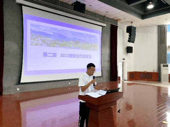 会议第二项,由2023级本科生冯炳宝代表全体新生发言。他表达了进入博彩社区