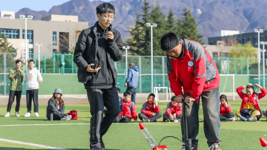 随后,航天科普志愿者服务队的同学们指导三高小学的同学们动手制作水火箭,并进行了发射实验。通过调整水的配比与发射角度,四枚“自制火箭”成功升空,现场掌声雷动。活动还特别设置了固体火箭模型讲解环节,结合西北工业大学在航天领域的科研成就,激发孩子们的“飞天梦”。
