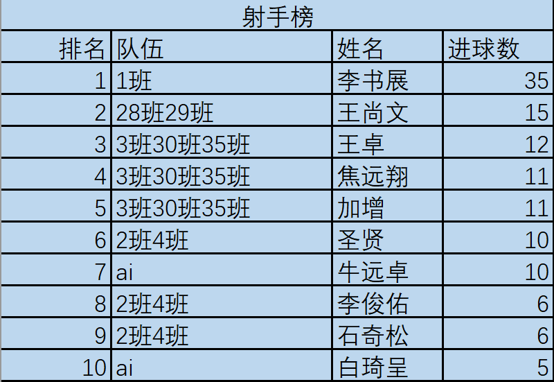 10011901班队李书展以35粒进球在射手榜上一骑绝尘,拿下金靴奖的荣誉!此外,大一大二各队得分手都为比赛贡献了许多精彩进球。