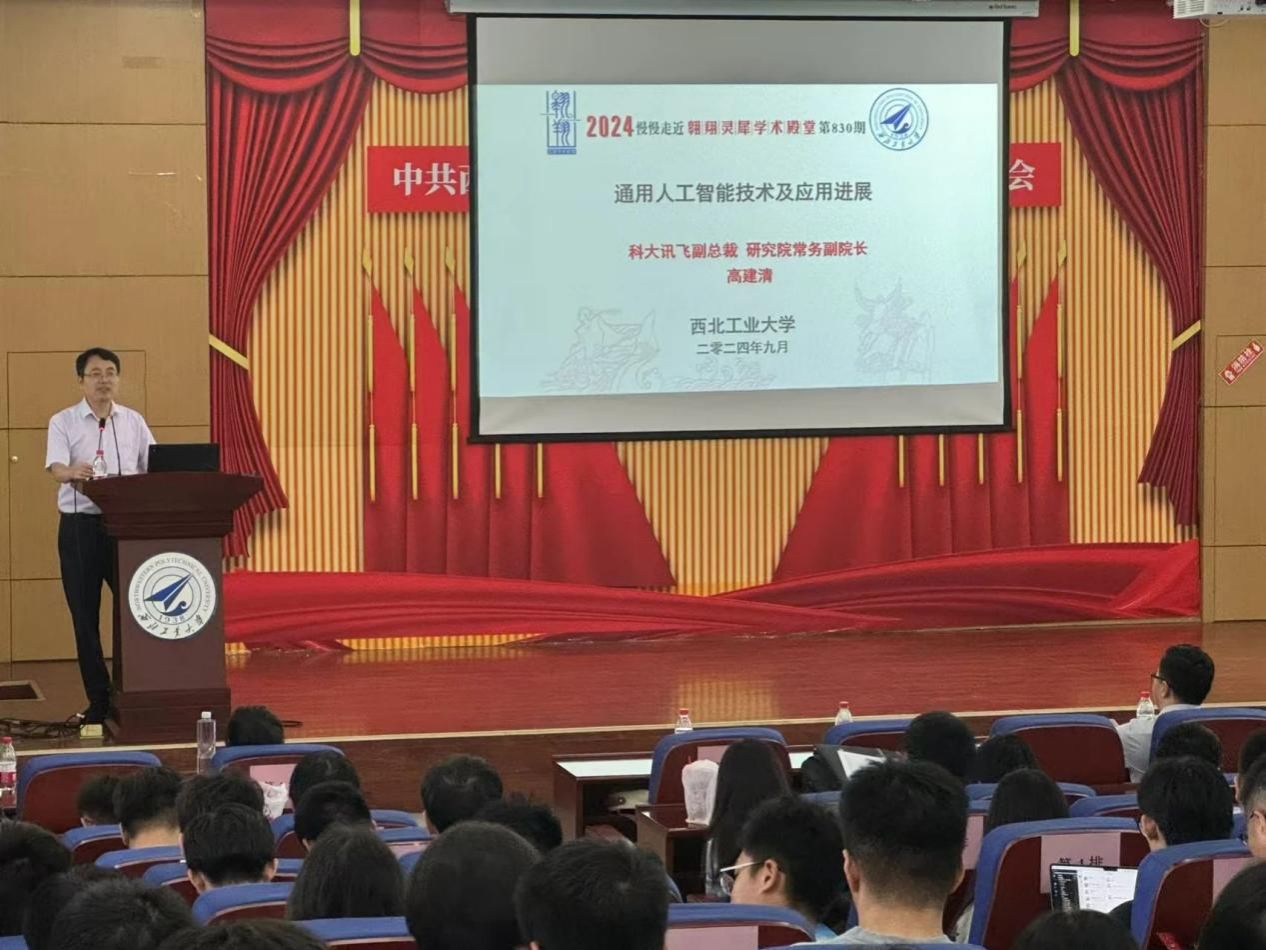 李春科介绍了高建清博士在多模态、语音大模型领域取得的突出成果,诚挚欢迎高建清博士做客西工大翱翔灵犀学术殿堂,同时向在场师生介绍了本次报告会的背景和目的,并对当前通用人工智能技术及应用进展进行了简要概述。