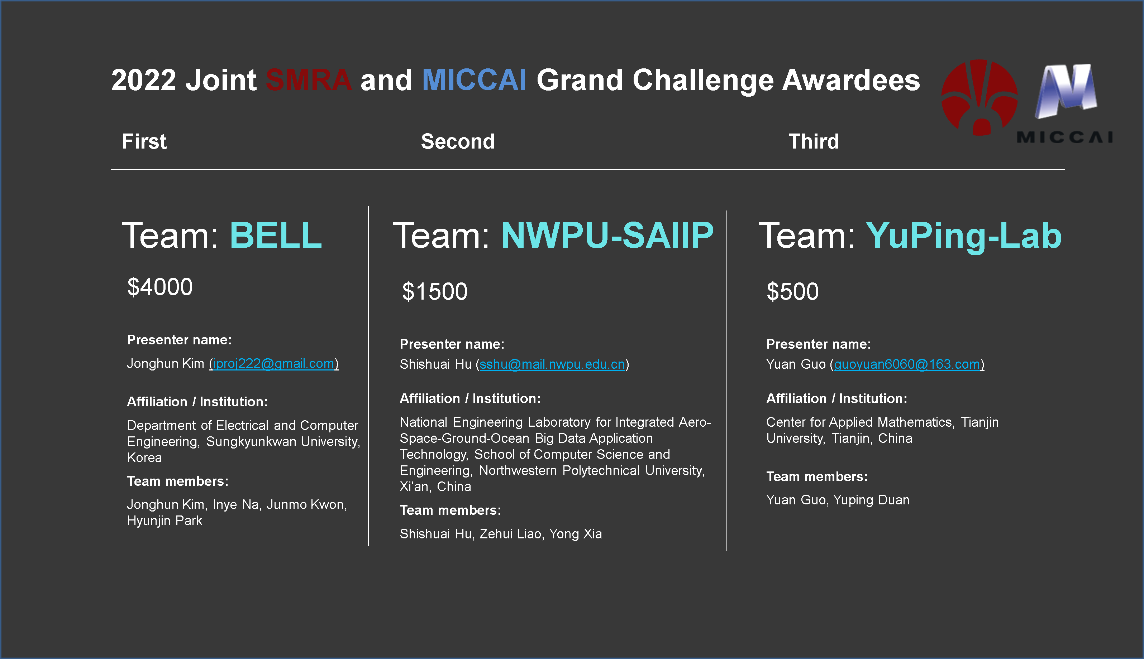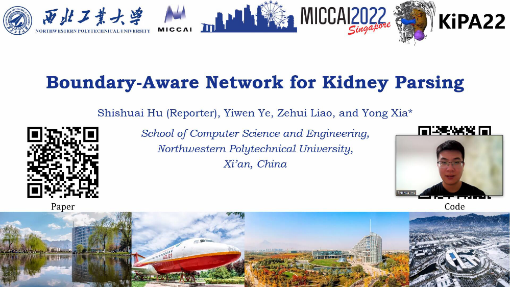 的空天地海一体化大数据应用技术国家工程实验室夏勇教授课题组博士生胡诗帅、叶艺文和廖泽慧组队在肾脏结构分割(Kidney PArsing Challenge,KiPA 2022)竞赛中获得国际亚军并得获创新奖;博士生胡诗帅和廖泽慧组队在颈动脉血管分割和颈动脉斑块诊断(CarOtid vessel wall SegMentation and atherosclerOsis diagnosiS challenge,COSMOS 2022)竞赛中获得国际亚军,并在腹部多器官分割(Abdominal Multi-Organ Segmentation Challenge,AMOS 2022)竞赛的两个任务中均取得第五名。胡诗帅同学应邀在这三个竞赛的主办方组织的学术论坛上进行了成果展示和汇报。这是博彩社区