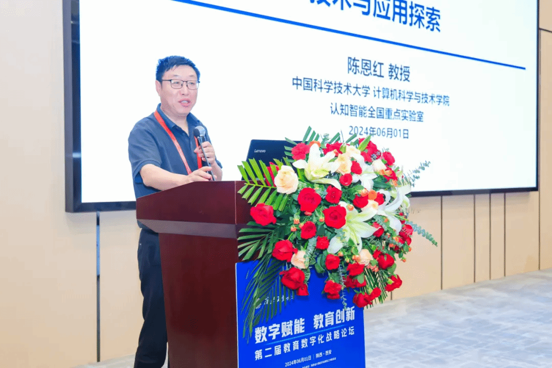 陈恩红以《面向智能教育的自适应学习技术与应用探索》为题,介绍了当前智能教育发展现状和趋势,分享了所在团队近年来在自适应学习领域的案例,展望了未来数字教育时代下自适应学习的发展方向。