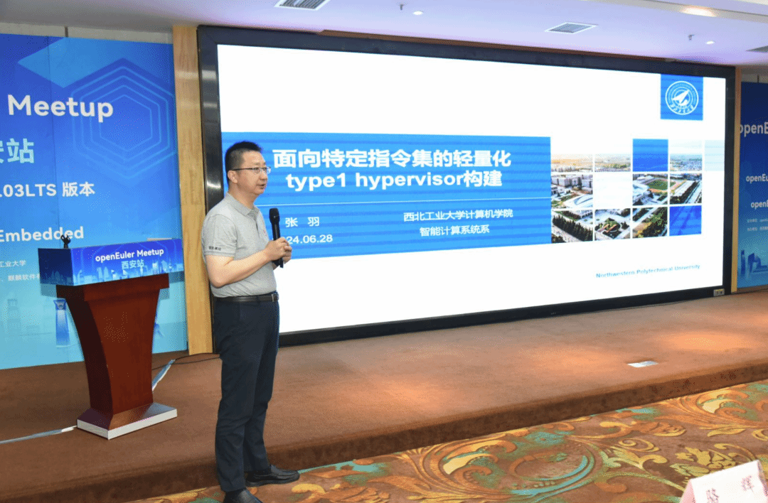 智能计算系统系张羽教授分享了其团队在针对嵌入式虚拟机管理方面的技术创新和成果。在“面向特定指令集的轻量化type1 hypervisor构建”议题里分享了他所带团队开发的基于LoongArch指令集的第一个轻量化Type-1型Hypervisor在嵌入式轻量级环境下如何更好地实现系统资源管理,同时还就该平台在系统能力人才培养中的应用与大家进行了交流。