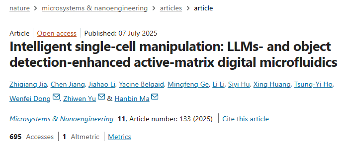 近日,人机物融合智能计算团队最新研究成果“Intelligent single-cell manipulation: LLMs- and object detection-enhanced active-matrix digital microfluidics”被Nature子刊《Microsystems and Nanoengineering》录用并在线发表。西北工业大学人机物融合智能计算创新中心(於志文教授,黄兴教授)、中心共建企业广东奥素液芯微纳科技有限公司(马汉彬研究员)、中国科博彩社区