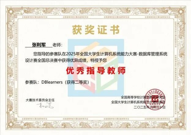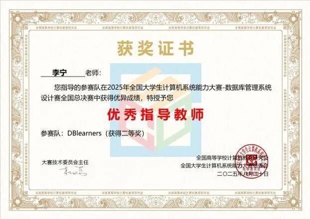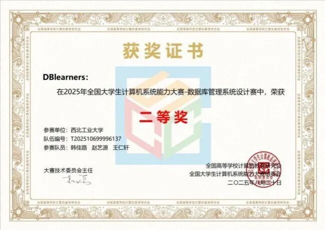 “DBlearners” 队实现多版本乐观并发控制升级使吞吐率倍增,以初赛 92 分、决赛tpmc值 1311 获全国二等奖,“碱基互补配队”获全国三等奖,两队均完成B +树索引等复杂内核功能并通过 TPCC 测试。