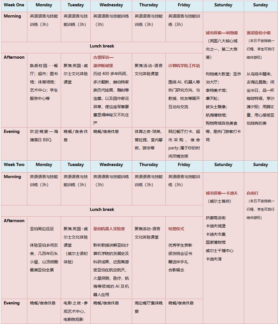 2024年的暑假,利用2周的时间,带领同学们沉浸式体验威尔士的大学氛围,在提高英语水平的同时,充分感受独特的威尔士文化魅力及欣赏亚伯当地无与伦比的自然风光。本项目除包含别具一格的趣味英语授课外,还会带大家参观威尔士最大的国家图书馆,游览英国历史名城切斯特,感受英伦文化及享受当地特色美食等。学员完成课程后,会获得亚伯大学颁发的结业证书,表现优秀学员亦可获得导师推荐信。