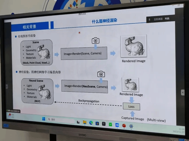 Huang Xin delivered a theme report of "Radiation Field Reconstruction Based on Neural Cameras" based on her experience in attending the CVPR22-23. Neural Radiation Field (NeRF) is a newly emerged method for represent neural scenes. Unlike traditional representation methods, neural radiation fields use multi-layer perceptron (MLP) to implicitly model three-dimensional scenes. High fidelity points of sight can be synthesized through volume rendering. However, existing methods overlook the impact of imaging on the reconstructed content, resulting in low dynamic range, limited resolution, and limited depth of field in the scenes reconstructed by NeRF. In this sharing, Huang mainly introduced the neuroimaging model. By introducing solutions such as the response function based on neural camera, neural imaging model, and local ray function, the researchers have expanded the dynamic range of neural scene expression, achieving controllable resolution. These methods have produced significant experimental results in HDR imaging, full focus imaging, and resolution variable rendering, providing new ideas and solutions for the development of neural rendering.